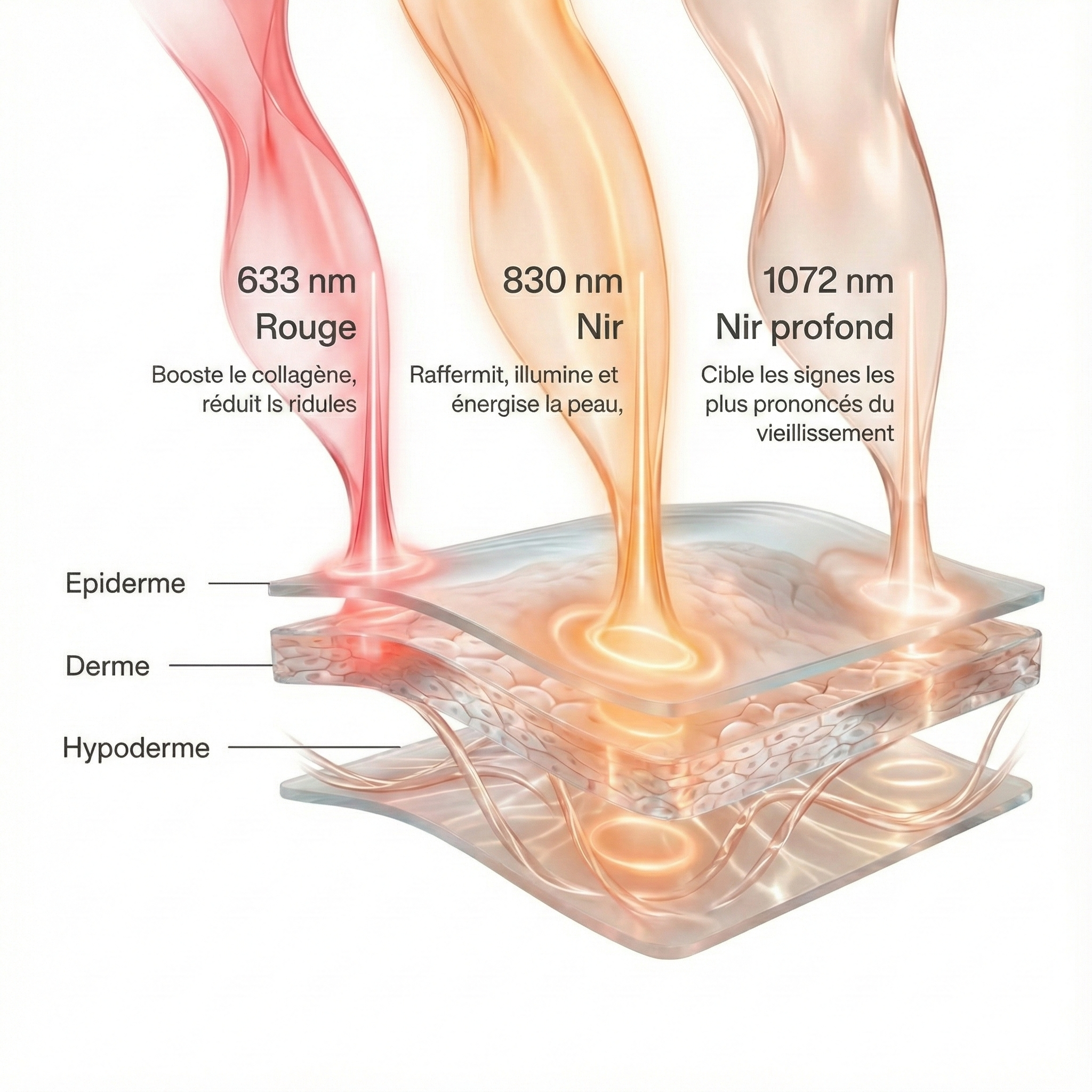 | Inspiré par la dermatologie | Technologie approuvée par la FDA | Longueurs d'ondes scientifiquement prouvées |